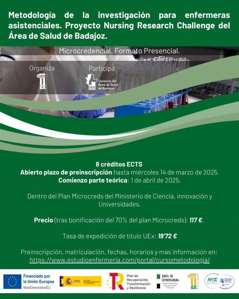 El curso «Metodología de la investigación para enfermeras asistenciales. Proyecto Nursing Research Challenge del Área de Salud de Badajoz» es una microcredencial presencial de 8 créditos ECTS, acreditada por la Universidad de Extremadura. Diseñada para profesionales de enfermería del Área de Salud de Badajoz, esta formación ofrece un 70% de descuento gracias al Plan Microcreds del Ministerio de Ciencia, Innovación y Universidades, reduciendo el precio de matrícula a 117€. El curso busca capacitar a las enfermeras en el método científico y en el diseño de proyectos, fomentando una práctica clínica basada en la evidencia y mejorando la calidad del cuidado.