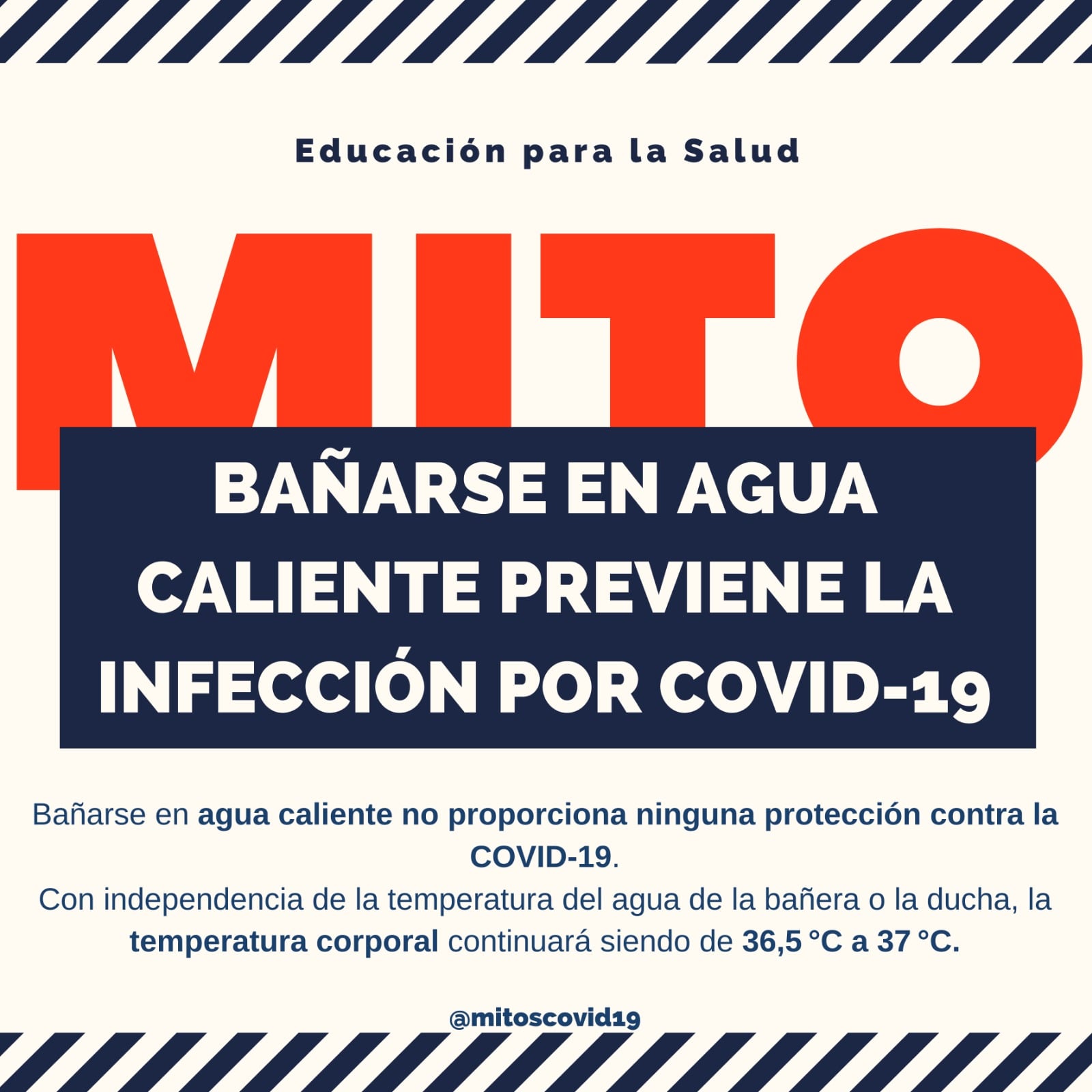 Bañarse en agua caliente no proporciona ninguna protección contra la COVID-19. Con independencia de la temperatura del agua de la bañera o la ducha, la temperatura corporal continuará siendo de 36,5 °C a 37 °C. De hecho, si el agua está muy caliente puede uno quemarse. Lo mejor que se puede hacer para protegerse de la COVID-19 es lavarse las manos con frecuencia para eliminar los virus que pueda haber en su superficie y no contagiarnos al tocarnos los ojos, la boca y la nariz.