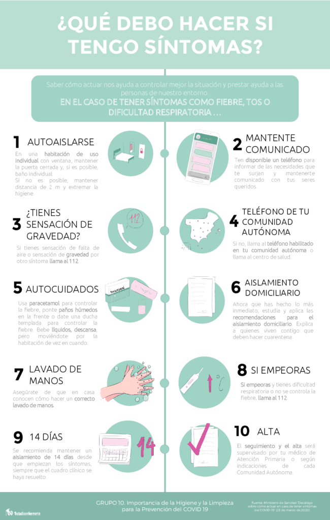 La información ha sido extraída del documento “Decálogo sobre cómo actuar en caso de síntomas” del Ministerio de Sanidad publicada el 25 de marzo de 2020.