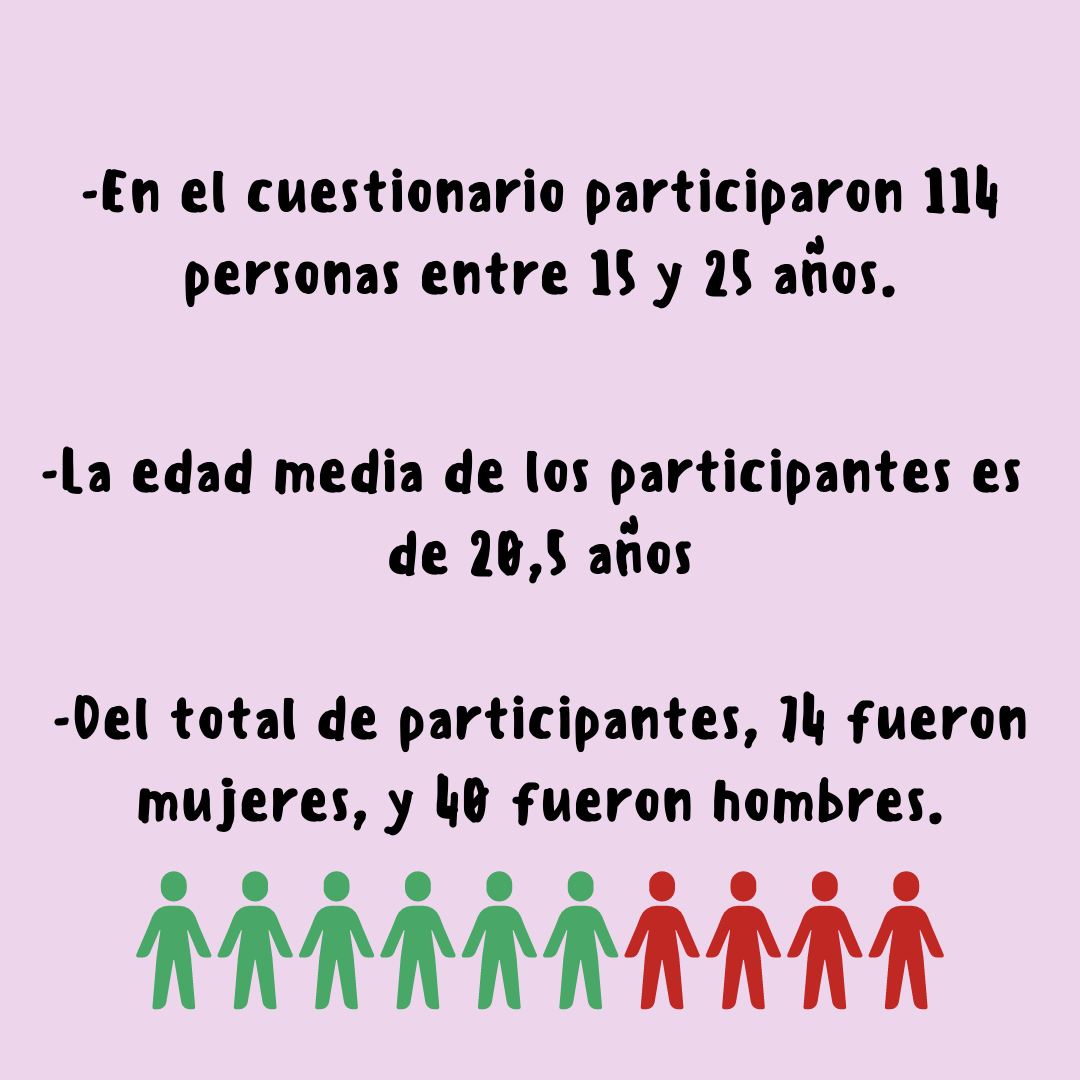 Queríamos obtener información sobre la ansiedad y la depresión en población joven. Para ello, realizamos una encuesta en la que participaron 114 personas de forma voluntaria y anónima.