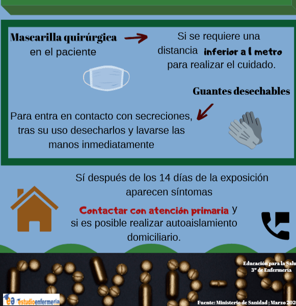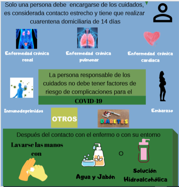 - La persona cuidadora no debe tener factores de riesgo de complicaciones, y debe realizar autovigilancia de los síntomas Guantes para cualquier contacto con secreciones.