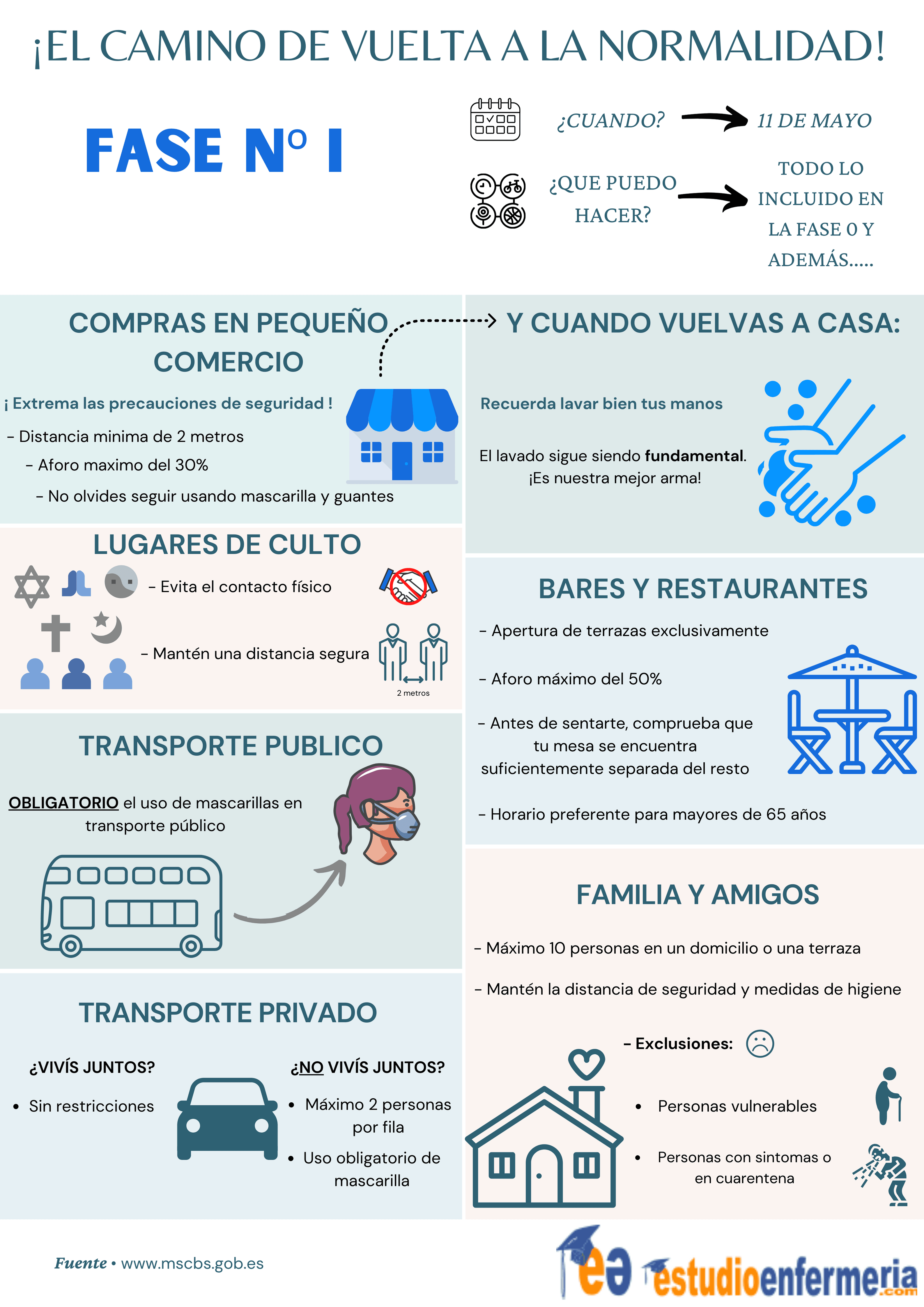 Nos pueden surgir muchas dudas ante las distintas fases de desescalada propuestas por el Gobierno de España, para aclarar algunas de ellas, en la siguiente imagen os dejo varias recomendaciones para afrontar de manera segura la primera fase del desconfinamiento.