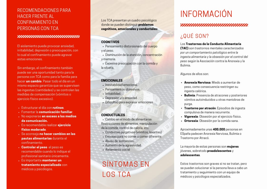 Las emociones desencadenadas por esta nueva situación, como el estrés o la ansiedad, pueden agravar los trastornos de la conducta alimentaria (TCA). Este problema es más frecuente en la población de lo que la mayoría podríamos pensar, por lo que hemos elaborado un tríptico en el que incluimos información para que todos podamos conocer un poco más sobre esta serie de trastornos y además, incluimos unas recomendaciones para aquellas personas que las necesiten.